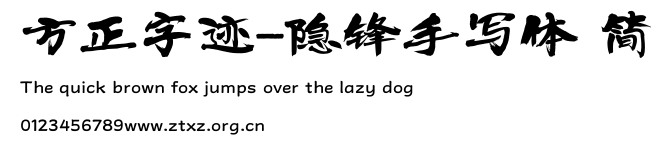 方正字迹-隐锋手写体 简.TTF是由字体厂商(设计师)方正出品的一款字体.方正字库隶属于北京北大方正电子有限公司(简称方正电子)。方正电子是专业从事中文字库开发的厂商,现拥有各种中、西文以及多民族文种字库数百款。作为享誉全球的方正中文电子出版系统的重要组成部分,方正字库一向以字款丰富,品质精良,适用面广,能迅速满足客户需求而在专业出版、印刷领域中享有盛誉。方正电子一向以推动中文字库技术进步,促进中文印刷字体的发展为己任,每年推出的创新字体都在十款以上。同时,方正电子还积极参与中国国家标准和国际ISO组织相关标准的制订,如GBK、GB18030、ISO/IEC-10646等。方正字库字款丰富、字形美观、性能稳定、适应面广,运行速度快,且存贮容量小。全面支持GB、GBK、GB18030、BIG-5以及JIS、KSC等编码体系,可以提供TrueType,PostScript Type1、Type0、CID等各种通用格式字库。方正字库官网http://www.foundertype.com/index.php/FindFont/index.html?utm_source=zitixiazai