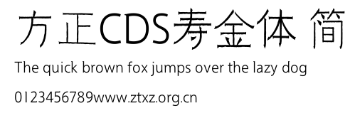 方正CDS寿金体 简.TTF是由字体厂商(设计师)方正出品的一款字体.方正字库隶属于北京北大方正电子有限公司(简称方正电子)。方正电子是专业从事中文字库开发的厂商,现拥有各种中、西文以及多民族文种字库数百款。作为享誉全球的方正中文电子出版系统的重要组成部分,方正字库一向以字款丰富,品质精良,适用面广,能迅速满足客户需求而在专业出版、印刷领域中享有盛誉。方正电子一向以推动中文字库技术进步,促进中文印刷字体的发展为己任,每年推出的创新字体都在十款以上。同时,方正电子还积极参与中国国家标准和国际ISO组织相关标准的制订,如GBK、GB18030、ISO/IEC-10646等。方正字库字款丰富、字形美观、性能稳定、适应面广,运行速度快,且存贮容量小。全面支持GB、GBK、GB18030、BIG-5以及JIS、KSC等编码体系,可以提供TrueType,PostScript Type1、Type0、CID等各种通用格式字库。方正字库官网http://www.foundertype.com/index.php/FindFont/index.html?utm_source=zitixiazai