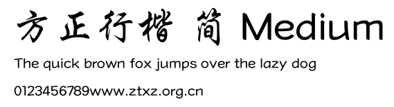 方正行楷 简 Medium.TTF是由字体厂商(设计师)方正出品的一款字体.方正字库隶属于北京北大方正电子有限公司(简称方正电子)。方正电子是专业从事中文字库开发的厂商,现拥有各种中、西文以及多民族文种字库数百款。作为享誉全球的方正中文电子出版系统的重要组成部分,方正字库一向以字款丰富,品质精良,适用面广,能迅速满足客户需求而在专业出版、印刷领域中享有盛誉。方正电子一向以推动中文字库技术进步,促进中文印刷字体的发展为己任,每年推出的创新字体都在十款以上。同时,方正电子还积极参与中国国家标准和国际ISO组织相关标准的制订,如GBK、GB18030、ISO/IEC-10646等。方正字库字款丰富、字形美观、性能稳定、适应面广,运行速度快,且存贮容量小。全面支持GB、GBK、GB18030、BIG-5以及JIS、KSC等编码体系,可以提供TrueType,PostScript Type1、Type0、CID等各种通用格式字库。方正字库官网http://www.foundertype.com/index.php/FindFont/index.html?utm_source=zitixiazai