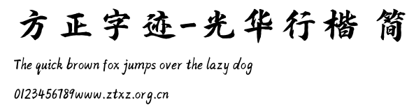方正字迹-光华行楷 简.TTF是由字体厂商(设计师)方正出品的一款字体.方正字库隶属于北京北大方正电子有限公司(简称方正电子)。方正电子是专业从事中文字库开发的厂商,现拥有各种中、西文以及多民族文种字库数百款。作为享誉全球的方正中文电子出版系统的重要组成部分,方正字库一向以字款丰富,品质精良,适用面广,能迅速满足客户需求而在专业出版、印刷领域中享有盛誉。方正电子一向以推动中文字库技术进步,促进中文印刷字体的发展为己任,每年推出的创新字体都在十款以上。同时,方正电子还积极参与中国国家标准和国际ISO组织相关标准的制订,如GBK、GB18030、ISO/IEC-10646等。方正字库字款丰富、字形美观、性能稳定、适应面广,运行速度快,且存贮容量小。全面支持GB、GBK、GB18030、BIG-5以及JIS、KSC等编码体系,可以提供TrueType,PostScript Type1、Type0、CID等各种通用格式字库。方正字库官网http://www.foundertype.com/index.php/FindFont/index.html?utm_source=zitixiazai
