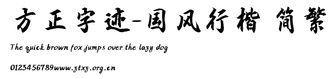 方正字迹-国风行楷 简繁.TTF是由字体厂商(设计师)方正出品的一款字体.方正字库隶属于北京北大方正电子有限公司(简称方正电子)。方正电子是专业从事中文字库开发的厂商,现拥有各种中、西文以及多民族文种字库数百款。作为享誉全球的方正中文电子出版系统的重要组成部分,方正字库一向以字款丰富,品质精良,适用面广,能迅速满足客户需求而在专业出版、印刷领域中享有盛誉。方正电子一向以推动中文字库技术进步,促进中文印刷字体的发展为己任,每年推出的创新字体都在十款以上。同时,方正电子还积极参与中国国家标准和国际ISO组织相关标准的制订,如GBK、GB18030、ISO/IEC-10646等。方正字库字款丰富、字形美观、性能稳定、适应面广,运行速度快,且存贮容量小。全面支持GB、GBK、GB18030、BIG-5以及JIS、KSC等编码体系,可以提供TrueType,PostScript Type1、Type0、CID等各种通用格式字库。方正字库官网http://www.foundertype.com/index.php/FindFont/index.html?utm_source=zitixiazai