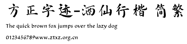 方正字迹-酒仙行楷 简繁.TTF是由字体厂商(设计师)方正出品的一款字体.方正字库隶属于北京北大方正电子有限公司(简称方正电子)。方正电子是专业从事中文字库开发的厂商,现拥有各种中、西文以及多民族文种字库数百款。作为享誉全球的方正中文电子出版系统的重要组成部分,方正字库一向以字款丰富,品质精良,适用面广,能迅速满足客户需求而在专业出版、印刷领域中享有盛誉。方正电子一向以推动中文字库技术进步,促进中文印刷字体的发展为己任,每年推出的创新字体都在十款以上。同时,方正电子还积极参与中国国家标准和国际ISO组织相关标准的制订,如GBK、GB18030、ISO/IEC-10646等。方正字库字款丰富、字形美观、性能稳定、适应面广,运行速度快,且存贮容量小。全面支持GB、GBK、GB18030、BIG-5以及JIS、KSC等编码体系,可以提供TrueType,PostScript Type1、Type0、CID等各种通用格式字库。方正字库官网http://www.foundertype.com/index.php/FindFont/index.html?utm_source=zitixiazai