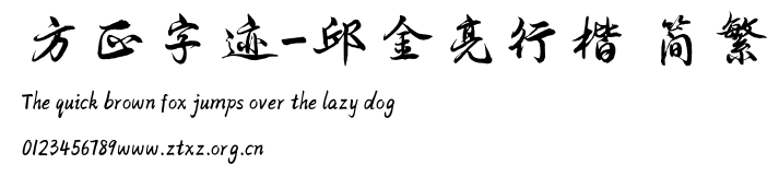 方正字迹-邱金亮行楷 简繁.TTF是由字体厂商(设计师)方正出品的一款字体.方正字库隶属于北京北大方正电子有限公司(简称方正电子)。方正电子是专业从事中文字库开发的厂商,现拥有各种中、西文以及多民族文种字库数百款。作为享誉全球的方正中文电子出版系统的重要组成部分,方正字库一向以字款丰富,品质精良,适用面广,能迅速满足客户需求而在专业出版、印刷领域中享有盛誉。方正电子一向以推动中文字库技术进步,促进中文印刷字体的发展为己任,每年推出的创新字体都在十款以上。同时,方正电子还积极参与中国国家标准和国际ISO组织相关标准的制订,如GBK、GB18030、ISO/IEC-10646等。方正字库字款丰富、字形美观、性能稳定、适应面广,运行速度快,且存贮容量小。全面支持GB、GBK、GB18030、BIG-5以及JIS、KSC等编码体系,可以提供TrueType,PostScript Type1、Type0、CID等各种通用格式字库。方正字库官网http://www.foundertype.com/index.php/FindFont/index.html?utm_source=zitixiazai