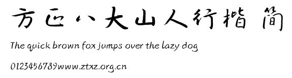 方正八大山人行楷 简.TTF是由字体厂商(设计师)方正出品的一款字体.方正字库隶属于北京北大方正电子有限公司(简称方正电子)。方正电子是专业从事中文字库开发的厂商,现拥有各种中、西文以及多民族文种字库数百款。作为享誉全球的方正中文电子出版系统的重要组成部分,方正字库一向以字款丰富,品质精良,适用面广,能迅速满足客户需求而在专业出版、印刷领域中享有盛誉。方正电子一向以推动中文字库技术进步,促进中文印刷字体的发展为己任,每年推出的创新字体都在十款以上。同时,方正电子还积极参与中国国家标准和国际ISO组织相关标准的制订,如GBK、GB18030、ISO/IEC-10646等。方正字库字款丰富、字形美观、性能稳定、适应面广,运行速度快,且存贮容量小。全面支持GB、GBK、GB18030、BIG-5以及JIS、KSC等编码体系,可以提供TrueType,PostScript Type1、Type0、CID等各种通用格式字库。方正字库官网http://www.foundertype.com/index.php/FindFont/index.html?utm_source=zitixiazai