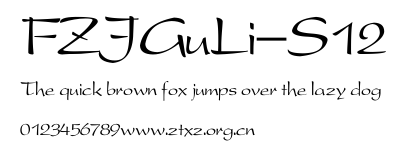 FZJGuLi-S12.TTF是由字体厂商(设计师)方正出品的一款字体.方正字库隶属于北京北大方正电子有限公司(简称方正电子)。方正电子是专业从事中文字库开发的厂商,现拥有各种中、西文以及多民族文种字库数百款。作为享誉全球的方正中文电子出版系统的重要组成部分,方正字库一向以字款丰富,品质精良,适用面广,能迅速满足客户需求而在专业出版、印刷领域中享有盛誉。方正电子一向以推动中文字库技术进步,促进中文印刷字体的发展为己任,每年推出的创新字体都在十款以上。同时,方正电子还积极参与中国国家标准和国际ISO组织相关标准的制订,如GBK、GB18030、ISO/IEC-10646等。方正字库字款丰富、字形美观、性能稳定、适应面广,运行速度快,且存贮容量小。全面支持GB、GBK、GB18030、BIG-5以及JIS、KSC等编码体系,可以提供TrueType,PostScript Type1、Type0、CID等各种通用格式字库。方正字库官网http://www.foundertype.com/index.php/FindFont/index.html?utm_source=zitixiazai