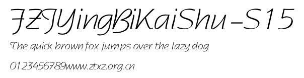FZJYingBiKaiShu-S15.TTF是由字体厂商(设计师)方正出品的一款字体.方正字库隶属于北京北大方正电子有限公司(简称方正电子)。方正电子是专业从事中文字库开发的厂商,现拥有各种中、西文以及多民族文种字库数百款。作为享誉全球的方正中文电子出版系统的重要组成部分,方正字库一向以字款丰富,品质精良,适用面广,能迅速满足客户需求而在专业出版、印刷领域中享有盛誉。方正电子一向以推动中文字库技术进步,促进中文印刷字体的发展为己任,每年推出的创新字体都在十款以上。同时,方正电子还积极参与中国国家标准和国际ISO组织相关标准的制订,如GBK、GB18030、ISO/IEC-10646等。方正字库字款丰富、字形美观、性能稳定、适应面广,运行速度快,且存贮容量小。全面支持GB、GBK、GB18030、BIG-5以及JIS、KSC等编码体系,可以提供TrueType,PostScript Type1、Type0、CID等各种通用格式字库。方正字库官网http://www.foundertype.com/index.php/FindFont/index.html?utm_source=zitixiazai