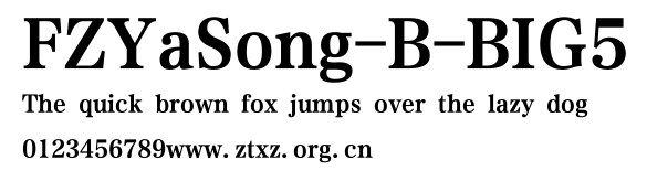 FZYaSong-B-BIG5.TTF是由字体厂商(设计师)方正出品的一款字体.方正字库隶属于北京北大方正电子有限公司(简称方正电子)。方正电子是专业从事中文字库开发的厂商,现拥有各种中、西文以及多民族文种字库数百款。作为享誉全球的方正中文电子出版系统的重要组成部分,方正字库一向以字款丰富,品质精良,适用面广,能迅速满足客户需求而在专业出版、印刷领域中享有盛誉。方正电子一向以推动中文字库技术进步,促进中文印刷字体的发展为己任,每年推出的创新字体都在十款以上。同时,方正电子还积极参与中国国家标准和国际ISO组织相关标准的制订,如GBK、GB18030、ISO/IEC-10646等。方正字库字款丰富、字形美观、性能稳定、适应面广,运行速度快,且存贮容量小。全面支持GB、GBK、GB18030、BIG-5以及JIS、KSC等编码体系,可以提供TrueType,PostScript Type1、Type0、CID等各种通用格式字库。方正字库官网http://www.foundertype.com/index.php/FindFont/index.html?utm_source=zitixiazai