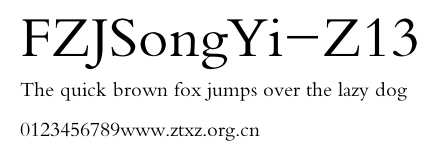 FZJSongYi-Z13.TTF是由字体厂商(设计师)方正出品的一款字体.方正字库隶属于北京北大方正电子有限公司(简称方正电子)。方正电子是专业从事中文字库开发的厂商,现拥有各种中、西文以及多民族文种字库数百款。作为享誉全球的方正中文电子出版系统的重要组成部分,方正字库一向以字款丰富,品质精良,适用面广,能迅速满足客户需求而在专业出版、印刷领域中享有盛誉。方正电子一向以推动中文字库技术进步,促进中文印刷字体的发展为己任,每年推出的创新字体都在十款以上。同时,方正电子还积极参与中国国家标准和国际ISO组织相关标准的制订,如GBK、GB18030、ISO/IEC-10646等。方正字库字款丰富、字形美观、性能稳定、适应面广,运行速度快,且存贮容量小。全面支持GB、GBK、GB18030、BIG-5以及JIS、KSC等编码体系,可以提供TrueType,PostScript Type1、Type0、CID等各种通用格式字库。方正字库官网http://www.foundertype.com/index.php/FindFont/index.html?utm_source=zitixiazai