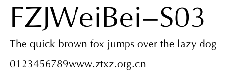 FZJWeiBei-S03.TTF是由字体厂商(设计师)方正出品的一款字体.方正字库隶属于北京北大方正电子有限公司(简称方正电子)。方正电子是专业从事中文字库开发的厂商,现拥有各种中、西文以及多民族文种字库数百款。作为享誉全球的方正中文电子出版系统的重要组成部分,方正字库一向以字款丰富,品质精良,适用面广,能迅速满足客户需求而在专业出版、印刷领域中享有盛誉。方正电子一向以推动中文字库技术进步,促进中文印刷字体的发展为己任,每年推出的创新字体都在十款以上。同时,方正电子还积极参与中国国家标准和国际ISO组织相关标准的制订,如GBK、GB18030、ISO/IEC-10646等。方正字库字款丰富、字形美观、性能稳定、适应面广,运行速度快,且存贮容量小。全面支持GB、GBK、GB18030、BIG-5以及JIS、KSC等编码体系,可以提供TrueType,PostScript Type1、Type0、CID等各种通用格式字库。方正字库官网http://www.foundertype.com/index.php/FindFont/index.html?utm_source=zitixiazai