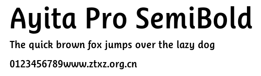Ayita Pro SemiBold.ttf是由字体厂商(设计师)方正出品的一款字体.方正字库隶属于北京北大方正电子有限公司(简称方正电子)。方正电子是专业从事中文字库开发的厂商,现拥有各种中、西文以及多民族文种字库数百款。作为享誉全球的方正中文电子出版系统的重要组成部分,方正字库一向以字款丰富,品质精良,适用面广,能迅速满足客户需求而在专业出版、印刷领域中享有盛誉。方正电子一向以推动中文字库技术进步,促进中文印刷字体的发展为己任,每年推出的创新字体都在十款以上。同时,方正电子还积极参与中国国家标准和国际ISO组织相关标准的制订,如GBK、GB18030、ISO/IEC-10646等。方正字库字款丰富、字形美观、性能稳定、适应面广,运行速度快,且存贮容量小。全面支持GB、GBK、GB18030、BIG-5以及JIS、KSC等编码体系,可以提供TrueType,PostScript Type1、Type0、CID等各种通用格式字库。方正字库官网http://www.foundertype.com/index.php/FindFont/index.html?utm_source=zitixiazai