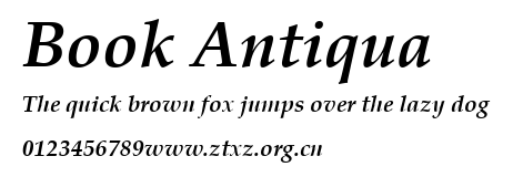 Book Antiqua.ttf是由字体厂商(设计师)方正出品的一款字体.方正字库隶属于北京北大方正电子有限公司(简称方正电子)。方正电子是专业从事中文字库开发的厂商,现拥有各种中、西文以及多民族文种字库数百款。作为享誉全球的方正中文电子出版系统的重要组成部分,方正字库一向以字款丰富,品质精良,适用面广,能迅速满足客户需求而在专业出版、印刷领域中享有盛誉。方正电子一向以推动中文字库技术进步,促进中文印刷字体的发展为己任,每年推出的创新字体都在十款以上。同时,方正电子还积极参与中国国家标准和国际ISO组织相关标准的制订,如GBK、GB18030、ISO/IEC-10646等。方正字库字款丰富、字形美观、性能稳定、适应面广,运行速度快,且存贮容量小。全面支持GB、GBK、GB18030、BIG-5以及JIS、KSC等编码体系,可以提供TrueType,PostScript Type1、Type0、CID等各种通用格式字库。方正字库官网http://www.foundertype.com/index.php/FindFont/index.html?utm_source=zitixiazai