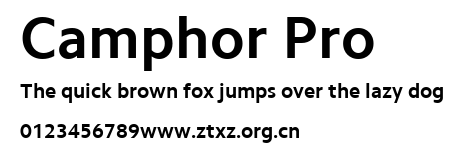 Camphor Pro.ttf是由字体厂商(设计师)方正出品的一款字体.方正字库隶属于北京北大方正电子有限公司(简称方正电子)。方正电子是专业从事中文字库开发的厂商,现拥有各种中、西文以及多民族文种字库数百款。作为享誉全球的方正中文电子出版系统的重要组成部分,方正字库一向以字款丰富,品质精良,适用面广,能迅速满足客户需求而在专业出版、印刷领域中享有盛誉。方正电子一向以推动中文字库技术进步,促进中文印刷字体的发展为己任,每年推出的创新字体都在十款以上。同时,方正电子还积极参与中国国家标准和国际ISO组织相关标准的制订,如GBK、GB18030、ISO/IEC-10646等。方正字库字款丰富、字形美观、性能稳定、适应面广,运行速度快,且存贮容量小。全面支持GB、GBK、GB18030、BIG-5以及JIS、KSC等编码体系,可以提供TrueType,PostScript Type1、Type0、CID等各种通用格式字库。方正字库官网http://www.foundertype.com/index.php/FindFont/index.html?utm_source=zitixiazai
