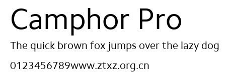 Camphor Pro.ttf是由字体厂商(设计师)方正出品的一款字体.方正字库隶属于北京北大方正电子有限公司(简称方正电子)。方正电子是专业从事中文字库开发的厂商,现拥有各种中、西文以及多民族文种字库数百款。作为享誉全球的方正中文电子出版系统的重要组成部分,方正字库一向以字款丰富,品质精良,适用面广,能迅速满足客户需求而在专业出版、印刷领域中享有盛誉。方正电子一向以推动中文字库技术进步,促进中文印刷字体的发展为己任,每年推出的创新字体都在十款以上。同时,方正电子还积极参与中国国家标准和国际ISO组织相关标准的制订,如GBK、GB18030、ISO/IEC-10646等。方正字库字款丰富、字形美观、性能稳定、适应面广,运行速度快,且存贮容量小。全面支持GB、GBK、GB18030、BIG-5以及JIS、KSC等编码体系,可以提供TrueType,PostScript Type1、Type0、CID等各种通用格式字库。方正字库官网http://www.foundertype.com/index.php/FindFont/index.html?utm_source=zitixiazai