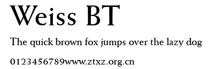 Weiss BT.ttf是由字体厂商(设计师)方正出品的一款字体.方正字库隶属于北京北大方正电子有限公司(简称方正电子)。方正电子是专业从事中文字库开发的厂商,现拥有各种中、西文以及多民族文种字库数百款。作为享誉全球的方正中文电子出版系统的重要组成部分,方正字库一向以字款丰富,品质精良,适用面广,能迅速满足客户需求而在专业出版、印刷领域中享有盛誉。方正电子一向以推动中文字库技术进步,促进中文印刷字体的发展为己任,每年推出的创新字体都在十款以上。同时,方正电子还积极参与中国国家标准和国际ISO组织相关标准的制订,如GBK、GB18030、ISO/IEC-10646等。方正字库字款丰富、字形美观、性能稳定、适应面广,运行速度快,且存贮容量小。全面支持GB、GBK、GB18030、BIG-5以及JIS、KSC等编码体系,可以提供TrueType,PostScript Type1、Type0、CID等各种通用格式字库。方正字库官网http://www.foundertype.com/index.php/FindFont/index.html?utm_source=zitixiazai