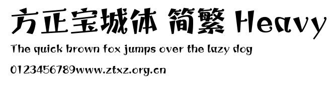 方正宝城体 简繁 Heavy.ttf是由字体厂商(设计师)方正出品的一款字体.方正字库隶属于北京北大方正电子有限公司(简称方正电子)。方正电子是专业从事中文字库开发的厂商,现拥有各种中、西文以及多民族文种字库数百款。作为享誉全球的方正中文电子出版系统的重要组成部分,方正字库一向以字款丰富,品质精良,适用面广,能迅速满足客户需求而在专业出版、印刷领域中享有盛誉。方正电子一向以推动中文字库技术进步,促进中文印刷字体的发展为己任,每年推出的创新字体都在十款以上。同时,方正电子还积极参与中国国家标准和国际ISO组织相关标准的制订,如GBK、GB18030、ISO/IEC-10646等。方正字库字款丰富、字形美观、性能稳定、适应面广,运行速度快,且存贮容量小。全面支持GB、GBK、GB18030、BIG-5以及JIS、KSC等编码体系,可以提供TrueType,PostScript Type1、Type0、CID等各种通用格式字库。方正字库官网http://www.foundertype.com/index.php/FindFont/index.html?utm_source=zitixiazai