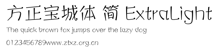 方正宝城体 简 ExtraLight.ttf是由字体厂商(设计师)方正出品的一款字体.方正字库隶属于北京北大方正电子有限公司(简称方正电子)。方正电子是专业从事中文字库开发的厂商,现拥有各种中、西文以及多民族文种字库数百款。作为享誉全球的方正中文电子出版系统的重要组成部分,方正字库一向以字款丰富,品质精良,适用面广,能迅速满足客户需求而在专业出版、印刷领域中享有盛誉。方正电子一向以推动中文字库技术进步,促进中文印刷字体的发展为己任,每年推出的创新字体都在十款以上。同时,方正电子还积极参与中国国家标准和国际ISO组织相关标准的制订,如GBK、GB18030、ISO/IEC-10646等。方正字库字款丰富、字形美观、性能稳定、适应面广,运行速度快,且存贮容量小。全面支持GB、GBK、GB18030、BIG-5以及JIS、KSC等编码体系,可以提供TrueType,PostScript Type1、Type0、CID等各种通用格式字库。方正字库官网http://www.foundertype.com/index.php/FindFont/index.html?utm_source=zitixiazai