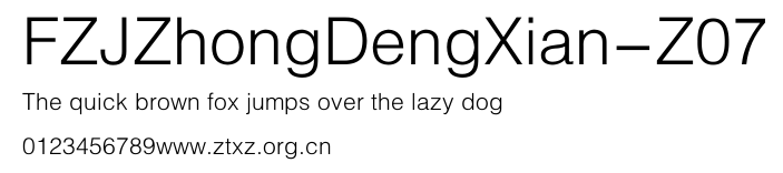 FZJZhongDengXian-Z07.ttf是由字体厂商(设计师)方正出品的一款字体.方正字库隶属于北京北大方正电子有限公司(简称方正电子)。方正电子是专业从事中文字库开发的厂商,现拥有各种中、西文以及多民族文种字库数百款。作为享誉全球的方正中文电子出版系统的重要组成部分,方正字库一向以字款丰富,品质精良,适用面广,能迅速满足客户需求而在专业出版、印刷领域中享有盛誉。方正电子一向以推动中文字库技术进步,促进中文印刷字体的发展为己任,每年推出的创新字体都在十款以上。同时,方正电子还积极参与中国国家标准和国际ISO组织相关标准的制订,如GBK、GB18030、ISO/IEC-10646等。方正字库字款丰富、字形美观、性能稳定、适应面广,运行速度快,且存贮容量小。全面支持GB、GBK、GB18030、BIG-5以及JIS、KSC等编码体系,可以提供TrueType,PostScript Type1、Type0、CID等各种通用格式字库。方正字库官网http://www.foundertype.com/index.php/FindFont/index.html?utm_source=zitixiazai