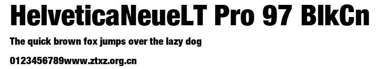 HelveticaNeueLT Pro 97 BlkCn.ttf是由字体厂商(设计师)方正出品的一款字体.方正字库隶属于北京北大方正电子有限公司(简称方正电子)。方正电子是专业从事中文字库开发的厂商,现拥有各种中、西文以及多民族文种字库数百款。作为享誉全球的方正中文电子出版系统的重要组成部分,方正字库一向以字款丰富,品质精良,适用面广,能迅速满足客户需求而在专业出版、印刷领域中享有盛誉。方正电子一向以推动中文字库技术进步,促进中文印刷字体的发展为己任,每年推出的创新字体都在十款以上。同时,方正电子还积极参与中国国家标准和国际ISO组织相关标准的制订,如GBK、GB18030、ISO/IEC-10646等。方正字库字款丰富、字形美观、性能稳定、适应面广,运行速度快,且存贮容量小。全面支持GB、GBK、GB18030、BIG-5以及JIS、KSC等编码体系,可以提供TrueType,PostScript Type1、Type0、CID等各种通用格式字库。方正字库官网http://www.foundertype.com/index.php/FindFont/index.html?utm_source=zitixiazai
