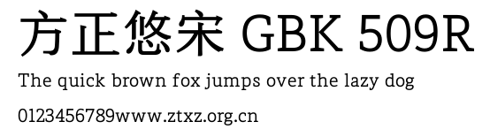 方正悠宋 GBK 509R.ttf是由字体厂商(设计师)方正出品的一款字体.方正字库隶属于北京北大方正电子有限公司(简称方正电子)。方正电子是专业从事中文字库开发的厂商,现拥有各种中、西文以及多民族文种字库数百款。作为享誉全球的方正中文电子出版系统的重要组成部分,方正字库一向以字款丰富,品质精良,适用面广,能迅速满足客户需求而在专业出版、印刷领域中享有盛誉。方正电子一向以推动中文字库技术进步,促进中文印刷字体的发展为己任,每年推出的创新字体都在十款以上。同时,方正电子还积极参与中国国家标准和国际ISO组织相关标准的制订,如GBK、GB18030、ISO/IEC-10646等。方正字库字款丰富、字形美观、性能稳定、适应面广,运行速度快,且存贮容量小。全面支持GB、GBK、GB18030、BIG-5以及JIS、KSC等编码体系,可以提供TrueType,PostScript Type1、Type0、CID等各种通用格式字库。方正字库官网http://www.foundertype.com/index.php/FindFont/index.html?utm_source=zitixiazai