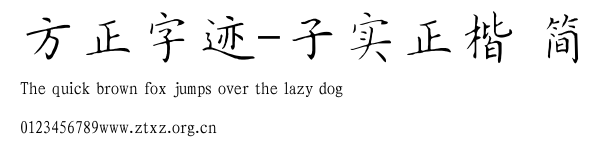 方正字迹-子实正楷 简.ttf是由字体厂商(设计师)方正出品的一款字体.方正字库隶属于北京北大方正电子有限公司(简称方正电子)。方正电子是专业从事中文字库开发的厂商,现拥有各种中、西文以及多民族文种字库数百款。作为享誉全球的方正中文电子出版系统的重要组成部分,方正字库一向以字款丰富,品质精良,适用面广,能迅速满足客户需求而在专业出版、印刷领域中享有盛誉。方正电子一向以推动中文字库技术进步,促进中文印刷字体的发展为己任,每年推出的创新字体都在十款以上。同时,方正电子还积极参与中国国家标准和国际ISO组织相关标准的制订,如GBK、GB18030、ISO/IEC-10646等。方正字库字款丰富、字形美观、性能稳定、适应面广,运行速度快,且存贮容量小。全面支持GB、GBK、GB18030、BIG-5以及JIS、KSC等编码体系,可以提供TrueType,PostScript Type1、Type0、CID等各种通用格式字库。方正字库官网http://www.foundertype.com/index.php/FindFont/index.html?utm_source=zitixiazai