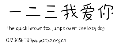一二三我爱你.ttf是由字体厂商(设计师)方正出品的一款字体.方正字库隶属于北京北大方正电子有限公司(简称方正电子)。方正电子是专业从事中文字库开发的厂商,现拥有各种中、西文以及多民族文种字库数百款。作为享誉全球的方正中文电子出版系统的重要组成部分,方正字库一向以字款丰富,品质精良,适用面广,能迅速满足客户需求而在专业出版、印刷领域中享有盛誉。方正电子一向以推动中文字库技术进步,促进中文印刷字体的发展为己任,每年推出的创新字体都在十款以上。同时,方正电子还积极参与中国国家标准和国际ISO组织相关标准的制订,如GBK、GB18030、ISO/IEC-10646等。方正字库字款丰富、字形美观、性能稳定、适应面广,运行速度快,且存贮容量小。全面支持GB、GBK、GB18030、BIG-5以及JIS、KSC等编码体系,可以提供TrueType,PostScript Type1、Type0、CID等各种通用格式字库。方正字库官网http://www.foundertype.com/index.php/FindFont/index.html?utm_source=zitixiazai