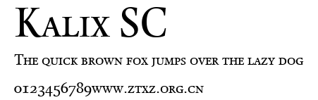 Kalix SC.ttf是由字体厂商(设计师)方正出品的一款字体.方正字库隶属于北京北大方正电子有限公司(简称方正电子)。方正电子是专业从事中文字库开发的厂商,现拥有各种中、西文以及多民族文种字库数百款。作为享誉全球的方正中文电子出版系统的重要组成部分,方正字库一向以字款丰富,品质精良,适用面广,能迅速满足客户需求而在专业出版、印刷领域中享有盛誉。方正电子一向以推动中文字库技术进步,促进中文印刷字体的发展为己任,每年推出的创新字体都在十款以上。同时,方正电子还积极参与中国国家标准和国际ISO组织相关标准的制订,如GBK、GB18030、ISO/IEC-10646等。方正字库字款丰富、字形美观、性能稳定、适应面广,运行速度快,且存贮容量小。全面支持GB、GBK、GB18030、BIG-5以及JIS、KSC等编码体系,可以提供TrueType,PostScript Type1、Type0、CID等各种通用格式字库。方正字库官网http://www.foundertype.com/index.php/FindFont/index.html?utm_source=zitixiazai