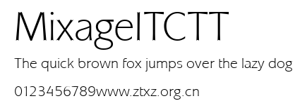MixageITCTT.ttf是由字体厂商(设计师)方正出品的一款字体.方正字库隶属于北京北大方正电子有限公司(简称方正电子)。方正电子是专业从事中文字库开发的厂商,现拥有各种中、西文以及多民族文种字库数百款。作为享誉全球的方正中文电子出版系统的重要组成部分,方正字库一向以字款丰富,品质精良,适用面广,能迅速满足客户需求而在专业出版、印刷领域中享有盛誉。方正电子一向以推动中文字库技术进步,促进中文印刷字体的发展为己任,每年推出的创新字体都在十款以上。同时,方正电子还积极参与中国国家标准和国际ISO组织相关标准的制订,如GBK、GB18030、ISO/IEC-10646等。方正字库字款丰富、字形美观、性能稳定、适应面广,运行速度快,且存贮容量小。全面支持GB、GBK、GB18030、BIG-5以及JIS、KSC等编码体系,可以提供TrueType,PostScript Type1、Type0、CID等各种通用格式字库。方正字库官网http://www.foundertype.com/index.php/FindFont/index.html?utm_source=zitixiazai