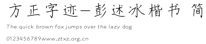方正字迹-彭述冰楷书 简.ttf是由字体厂商(设计师)方正出品的一款字体.方正字库隶属于北京北大方正电子有限公司(简称方正电子)。方正电子是专业从事中文字库开发的厂商,现拥有各种中、西文以及多民族文种字库数百款。作为享誉全球的方正中文电子出版系统的重要组成部分,方正字库一向以字款丰富,品质精良,适用面广,能迅速满足客户需求而在专业出版、印刷领域中享有盛誉。方正电子一向以推动中文字库技术进步,促进中文印刷字体的发展为己任,每年推出的创新字体都在十款以上。同时,方正电子还积极参与中国国家标准和国际ISO组织相关标准的制订,如GBK、GB18030、ISO/IEC-10646等。方正字库字款丰富、字形美观、性能稳定、适应面广,运行速度快,且存贮容量小。全面支持GB、GBK、GB18030、BIG-5以及JIS、KSC等编码体系,可以提供TrueType,PostScript Type1、Type0、CID等各种通用格式字库。方正字库官网http://www.foundertype.com/index.php/FindFont/index.html?utm_source=zitixiazai