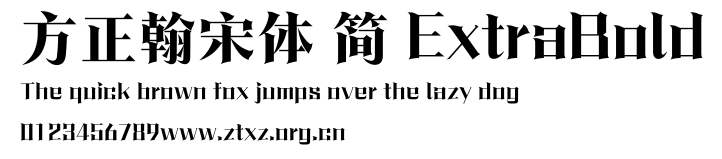 方正翰宋体 简 ExtraBold.ttf是由字体厂商(设计师)方正出品的一款字体.方正字库隶属于北京北大方正电子有限公司(简称方正电子)。方正电子是专业从事中文字库开发的厂商,现拥有各种中、西文以及多民族文种字库数百款。作为享誉全球的方正中文电子出版系统的重要组成部分,方正字库一向以字款丰富,品质精良,适用面广,能迅速满足客户需求而在专业出版、印刷领域中享有盛誉。方正电子一向以推动中文字库技术进步,促进中文印刷字体的发展为己任,每年推出的创新字体都在十款以上。同时,方正电子还积极参与中国国家标准和国际ISO组织相关标准的制订,如GBK、GB18030、ISO/IEC-10646等。方正字库字款丰富、字形美观、性能稳定、适应面广,运行速度快,且存贮容量小。全面支持GB、GBK、GB18030、BIG-5以及JIS、KSC等编码体系,可以提供TrueType,PostScript Type1、Type0、CID等各种通用格式字库。方正字库官网http://www.foundertype.com/index.php/FindFont/index.html?utm_source=zitixiazai