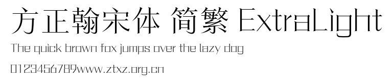 方正翰宋体 简繁 ExtraLight.ttf是由字体厂商(设计师)方正出品的一款字体.方正字库隶属于北京北大方正电子有限公司(简称方正电子)。方正电子是专业从事中文字库开发的厂商,现拥有各种中、西文以及多民族文种字库数百款。作为享誉全球的方正中文电子出版系统的重要组成部分,方正字库一向以字款丰富,品质精良,适用面广,能迅速满足客户需求而在专业出版、印刷领域中享有盛誉。方正电子一向以推动中文字库技术进步,促进中文印刷字体的发展为己任,每年推出的创新字体都在十款以上。同时,方正电子还积极参与中国国家标准和国际ISO组织相关标准的制订,如GBK、GB18030、ISO/IEC-10646等。方正字库字款丰富、字形美观、性能稳定、适应面广,运行速度快,且存贮容量小。全面支持GB、GBK、GB18030、BIG-5以及JIS、KSC等编码体系,可以提供TrueType,PostScript Type1、Type0、CID等各种通用格式字库。方正字库官网http://www.foundertype.com/index.php/FindFont/index.html?utm_source=zitixiazai