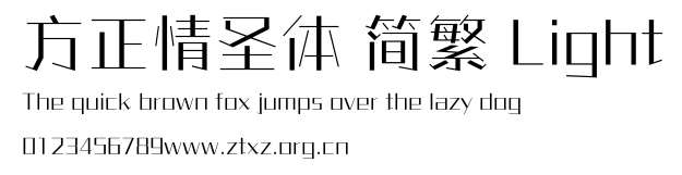 方正情圣体 简繁 Light.ttf是由字体厂商(设计师)方正出品的一款字体.方正字库隶属于北京北大方正电子有限公司(简称方正电子)。方正电子是专业从事中文字库开发的厂商,现拥有各种中、西文以及多民族文种字库数百款。作为享誉全球的方正中文电子出版系统的重要组成部分,方正字库一向以字款丰富,品质精良,适用面广,能迅速满足客户需求而在专业出版、印刷领域中享有盛誉。方正电子一向以推动中文字库技术进步,促进中文印刷字体的发展为己任,每年推出的创新字体都在十款以上。同时,方正电子还积极参与中国国家标准和国际ISO组织相关标准的制订,如GBK、GB18030、ISO/IEC-10646等。方正字库字款丰富、字形美观、性能稳定、适应面广,运行速度快,且存贮容量小。全面支持GB、GBK、GB18030、BIG-5以及JIS、KSC等编码体系,可以提供TrueType,PostScript Type1、Type0、CID等各种通用格式字库。方正字库官网http://www.foundertype.com/index.php/FindFont/index.html?utm_source=zitixiazai