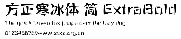 方正寒冰体 简 ExtraBold.ttf是由字体厂商(设计师)方正出品的一款字体.方正字库隶属于北京北大方正电子有限公司(简称方正电子)。方正电子是专业从事中文字库开发的厂商,现拥有各种中、西文以及多民族文种字库数百款。作为享誉全球的方正中文电子出版系统的重要组成部分,方正字库一向以字款丰富,品质精良,适用面广,能迅速满足客户需求而在专业出版、印刷领域中享有盛誉。方正电子一向以推动中文字库技术进步,促进中文印刷字体的发展为己任,每年推出的创新字体都在十款以上。同时,方正电子还积极参与中国国家标准和国际ISO组织相关标准的制订,如GBK、GB18030、ISO/IEC-10646等。方正字库字款丰富、字形美观、性能稳定、适应面广,运行速度快,且存贮容量小。全面支持GB、GBK、GB18030、BIG-5以及JIS、KSC等编码体系,可以提供TrueType,PostScript Type1、Type0、CID等各种通用格式字库。方正字库官网http://www.foundertype.com/index.php/FindFont/index.html?utm_source=zitixiazai