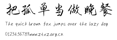 把孤单当做晚餐.ttf是由字体厂商(设计师)方正出品的一款字体.方正字库隶属于北京北大方正电子有限公司(简称方正电子)。方正电子是专业从事中文字库开发的厂商,现拥有各种中、西文以及多民族文种字库数百款。作为享誉全球的方正中文电子出版系统的重要组成部分,方正字库一向以字款丰富,品质精良,适用面广,能迅速满足客户需求而在专业出版、印刷领域中享有盛誉。方正电子一向以推动中文字库技术进步,促进中文印刷字体的发展为己任,每年推出的创新字体都在十款以上。同时,方正电子还积极参与中国国家标准和国际ISO组织相关标准的制订,如GBK、GB18030、ISO/IEC-10646等。方正字库字款丰富、字形美观、性能稳定、适应面广,运行速度快,且存贮容量小。全面支持GB、GBK、GB18030、BIG-5以及JIS、KSC等编码体系,可以提供TrueType,PostScript Type1、Type0、CID等各种通用格式字库。方正字库官网http://www.foundertype.com/index.php/FindFont/index.html?utm_source=zitixiazai