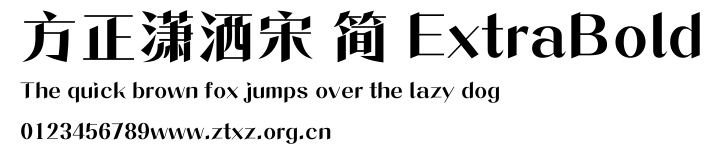 方正潇洒宋 简 ExtraBold.ttf是由字体厂商(设计师)方正出品的一款字体.方正字库隶属于北京北大方正电子有限公司(简称方正电子)。方正电子是专业从事中文字库开发的厂商,现拥有各种中、西文以及多民族文种字库数百款。作为享誉全球的方正中文电子出版系统的重要组成部分,方正字库一向以字款丰富,品质精良,适用面广,能迅速满足客户需求而在专业出版、印刷领域中享有盛誉。方正电子一向以推动中文字库技术进步,促进中文印刷字体的发展为己任,每年推出的创新字体都在十款以上。同时,方正电子还积极参与中国国家标准和国际ISO组织相关标准的制订,如GBK、GB18030、ISO/IEC-10646等。方正字库字款丰富、字形美观、性能稳定、适应面广,运行速度快,且存贮容量小。全面支持GB、GBK、GB18030、BIG-5以及JIS、KSC等编码体系,可以提供TrueType,PostScript Type1、Type0、CID等各种通用格式字库。方正字库官网http://www.foundertype.com/index.php/FindFont/index.html?utm_source=zitixiazai
