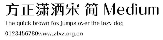 方正潇洒宋 简 Medium.ttf是由字体厂商(设计师)方正出品的一款字体.方正字库隶属于北京北大方正电子有限公司(简称方正电子)。方正电子是专业从事中文字库开发的厂商,现拥有各种中、西文以及多民族文种字库数百款。作为享誉全球的方正中文电子出版系统的重要组成部分,方正字库一向以字款丰富,品质精良,适用面广,能迅速满足客户需求而在专业出版、印刷领域中享有盛誉。方正电子一向以推动中文字库技术进步,促进中文印刷字体的发展为己任,每年推出的创新字体都在十款以上。同时,方正电子还积极参与中国国家标准和国际ISO组织相关标准的制订,如GBK、GB18030、ISO/IEC-10646等。方正字库字款丰富、字形美观、性能稳定、适应面广,运行速度快,且存贮容量小。全面支持GB、GBK、GB18030、BIG-5以及JIS、KSC等编码体系,可以提供TrueType,PostScript Type1、Type0、CID等各种通用格式字库。方正字库官网http://www.foundertype.com/index.php/FindFont/index.html?utm_source=zitixiazai