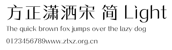 方正潇洒宋 简 Light.ttf是由字体厂商(设计师)方正出品的一款字体.方正字库隶属于北京北大方正电子有限公司(简称方正电子)。方正电子是专业从事中文字库开发的厂商,现拥有各种中、西文以及多民族文种字库数百款。作为享誉全球的方正中文电子出版系统的重要组成部分,方正字库一向以字款丰富,品质精良,适用面广,能迅速满足客户需求而在专业出版、印刷领域中享有盛誉。方正电子一向以推动中文字库技术进步,促进中文印刷字体的发展为己任,每年推出的创新字体都在十款以上。同时,方正电子还积极参与中国国家标准和国际ISO组织相关标准的制订,如GBK、GB18030、ISO/IEC-10646等。方正字库字款丰富、字形美观、性能稳定、适应面广,运行速度快,且存贮容量小。全面支持GB、GBK、GB18030、BIG-5以及JIS、KSC等编码体系,可以提供TrueType,PostScript Type1、Type0、CID等各种通用格式字库。方正字库官网http://www.foundertype.com/index.php/FindFont/index.html?utm_source=zitixiazai