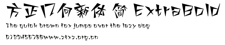 方正几何新体 简 ExtraBold.ttf是由字体厂商(设计师)方正出品的一款字体.方正字库隶属于北京北大方正电子有限公司(简称方正电子)。方正电子是专业从事中文字库开发的厂商,现拥有各种中、西文以及多民族文种字库数百款。作为享誉全球的方正中文电子出版系统的重要组成部分,方正字库一向以字款丰富,品质精良,适用面广,能迅速满足客户需求而在专业出版、印刷领域中享有盛誉。方正电子一向以推动中文字库技术进步,促进中文印刷字体的发展为己任,每年推出的创新字体都在十款以上。同时,方正电子还积极参与中国国家标准和国际ISO组织相关标准的制订,如GBK、GB18030、ISO/IEC-10646等。方正字库字款丰富、字形美观、性能稳定、适应面广,运行速度快,且存贮容量小。全面支持GB、GBK、GB18030、BIG-5以及JIS、KSC等编码体系,可以提供TrueType,PostScript Type1、Type0、CID等各种通用格式字库。方正字库官网http://www.foundertype.com/index.php/FindFont/index.html?utm_source=zitixiazai