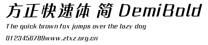 方正快速体 简 DemiBold.ttf是由字体厂商(设计师)方正出品的一款字体.方正字库隶属于北京北大方正电子有限公司(简称方正电子)。方正电子是专业从事中文字库开发的厂商,现拥有各种中、西文以及多民族文种字库数百款。作为享誉全球的方正中文电子出版系统的重要组成部分,方正字库一向以字款丰富,品质精良,适用面广,能迅速满足客户需求而在专业出版、印刷领域中享有盛誉。方正电子一向以推动中文字库技术进步,促进中文印刷字体的发展为己任,每年推出的创新字体都在十款以上。同时,方正电子还积极参与中国国家标准和国际ISO组织相关标准的制订,如GBK、GB18030、ISO/IEC-10646等。方正字库字款丰富、字形美观、性能稳定、适应面广,运行速度快,且存贮容量小。全面支持GB、GBK、GB18030、BIG-5以及JIS、KSC等编码体系,可以提供TrueType,PostScript Type1、Type0、CID等各种通用格式字库。方正字库官网http://www.foundertype.com/index.php/FindFont/index.html?utm_source=zitixiazai