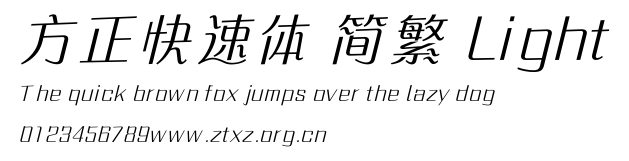 方正快速体 简繁 Light.ttf是由字体厂商(设计师)方正出品的一款字体.方正字库隶属于北京北大方正电子有限公司(简称方正电子)。方正电子是专业从事中文字库开发的厂商,现拥有各种中、西文以及多民族文种字库数百款。作为享誉全球的方正中文电子出版系统的重要组成部分,方正字库一向以字款丰富,品质精良,适用面广,能迅速满足客户需求而在专业出版、印刷领域中享有盛誉。方正电子一向以推动中文字库技术进步,促进中文印刷字体的发展为己任,每年推出的创新字体都在十款以上。同时,方正电子还积极参与中国国家标准和国际ISO组织相关标准的制订,如GBK、GB18030、ISO/IEC-10646等。方正字库字款丰富、字形美观、性能稳定、适应面广,运行速度快,且存贮容量小。全面支持GB、GBK、GB18030、BIG-5以及JIS、KSC等编码体系,可以提供TrueType,PostScript Type1、Type0、CID等各种通用格式字库。方正字库官网http://www.foundertype.com/index.php/FindFont/index.html?utm_source=zitixiazai