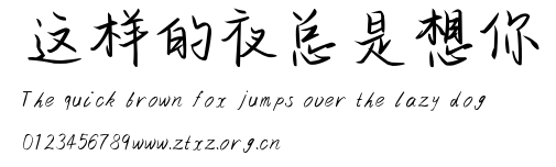 这样的夜总是想你.ttf是由字体厂商(设计师)方正出品的一款字体.方正字库隶属于北京北大方正电子有限公司(简称方正电子)。方正电子是专业从事中文字库开发的厂商,现拥有各种中、西文以及多民族文种字库数百款。作为享誉全球的方正中文电子出版系统的重要组成部分,方正字库一向以字款丰富,品质精良,适用面广,能迅速满足客户需求而在专业出版、印刷领域中享有盛誉。方正电子一向以推动中文字库技术进步,促进中文印刷字体的发展为己任,每年推出的创新字体都在十款以上。同时,方正电子还积极参与中国国家标准和国际ISO组织相关标准的制订,如GBK、GB18030、ISO/IEC-10646等。方正字库字款丰富、字形美观、性能稳定、适应面广,运行速度快,且存贮容量小。全面支持GB、GBK、GB18030、BIG-5以及JIS、KSC等编码体系,可以提供TrueType,PostScript Type1、Type0、CID等各种通用格式字库。方正字库官网http://www.foundertype.com/index.php/FindFont/index.html?utm_source=zitixiazai