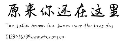 原来你还在这里.ttf是由字体厂商(设计师)方正出品的一款字体.方正字库隶属于北京北大方正电子有限公司(简称方正电子)。方正电子是专业从事中文字库开发的厂商,现拥有各种中、西文以及多民族文种字库数百款。作为享誉全球的方正中文电子出版系统的重要组成部分,方正字库一向以字款丰富,品质精良,适用面广,能迅速满足客户需求而在专业出版、印刷领域中享有盛誉。方正电子一向以推动中文字库技术进步,促进中文印刷字体的发展为己任,每年推出的创新字体都在十款以上。同时,方正电子还积极参与中国国家标准和国际ISO组织相关标准的制订,如GBK、GB18030、ISO/IEC-10646等。方正字库字款丰富、字形美观、性能稳定、适应面广,运行速度快,且存贮容量小。全面支持GB、GBK、GB18030、BIG-5以及JIS、KSC等编码体系,可以提供TrueType,PostScript Type1、Type0、CID等各种通用格式字库。方正字库官网http://www.foundertype.com/index.php/FindFont/index.html?utm_source=zitixiazai
