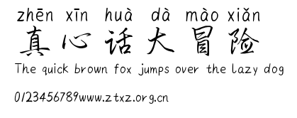 真心话大冒险.ttf是由字体厂商(设计师)方正出品的一款字体.方正字库隶属于北京北大方正电子有限公司(简称方正电子)。方正电子是专业从事中文字库开发的厂商,现拥有各种中、西文以及多民族文种字库数百款。作为享誉全球的方正中文电子出版系统的重要组成部分,方正字库一向以字款丰富,品质精良,适用面广,能迅速满足客户需求而在专业出版、印刷领域中享有盛誉。方正电子一向以推动中文字库技术进步,促进中文印刷字体的发展为己任,每年推出的创新字体都在十款以上。同时,方正电子还积极参与中国国家标准和国际ISO组织相关标准的制订,如GBK、GB18030、ISO/IEC-10646等。方正字库字款丰富、字形美观、性能稳定、适应面广,运行速度快,且存贮容量小。全面支持GB、GBK、GB18030、BIG-5以及JIS、KSC等编码体系,可以提供TrueType,PostScript Type1、Type0、CID等各种通用格式字库。方正字库官网http://www.foundertype.com/index.php/FindFont/index.html?utm_source=zitixiazai