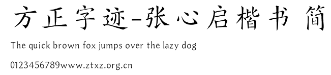 方正字迹-张心启楷书 简.ttf是由字体厂商(设计师)方正出品的一款字体.方正字库隶属于北京北大方正电子有限公司(简称方正电子)。方正电子是专业从事中文字库开发的厂商,现拥有各种中、西文以及多民族文种字库数百款。作为享誉全球的方正中文电子出版系统的重要组成部分,方正字库一向以字款丰富,品质精良,适用面广,能迅速满足客户需求而在专业出版、印刷领域中享有盛誉。方正电子一向以推动中文字库技术进步,促进中文印刷字体的发展为己任,每年推出的创新字体都在十款以上。同时,方正电子还积极参与中国国家标准和国际ISO组织相关标准的制订,如GBK、GB18030、ISO/IEC-10646等。方正字库字款丰富、字形美观、性能稳定、适应面广,运行速度快,且存贮容量小。全面支持GB、GBK、GB18030、BIG-5以及JIS、KSC等编码体系,可以提供TrueType,PostScript Type1、Type0、CID等各种通用格式字库。方正字库官网http://www.foundertype.com/index.php/FindFont/index.html?utm_source=zitixiazai