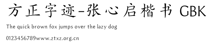 方正字迹-张心启楷书 GBK.ttf是由字体厂商(设计师)方正出品的一款字体.方正字库隶属于北京北大方正电子有限公司(简称方正电子)。方正电子是专业从事中文字库开发的厂商,现拥有各种中、西文以及多民族文种字库数百款。作为享誉全球的方正中文电子出版系统的重要组成部分,方正字库一向以字款丰富,品质精良,适用面广,能迅速满足客户需求而在专业出版、印刷领域中享有盛誉。方正电子一向以推动中文字库技术进步,促进中文印刷字体的发展为己任,每年推出的创新字体都在十款以上。同时,方正电子还积极参与中国国家标准和国际ISO组织相关标准的制订,如GBK、GB18030、ISO/IEC-10646等。方正字库字款丰富、字形美观、性能稳定、适应面广,运行速度快,且存贮容量小。全面支持GB、GBK、GB18030、BIG-5以及JIS、KSC等编码体系,可以提供TrueType,PostScript Type1、Type0、CID等各种通用格式字库。方正字库官网http://www.foundertype.com/index.php/FindFont/index.html?utm_source=zitixiazai