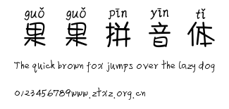 果果拼音体.ttf是由字体厂商(设计师)方正出品的一款字体.方正字库隶属于北京北大方正电子有限公司(简称方正电子)。方正电子是专业从事中文字库开发的厂商,现拥有各种中、西文以及多民族文种字库数百款。作为享誉全球的方正中文电子出版系统的重要组成部分,方正字库一向以字款丰富,品质精良,适用面广,能迅速满足客户需求而在专业出版、印刷领域中享有盛誉。方正电子一向以推动中文字库技术进步,促进中文印刷字体的发展为己任,每年推出的创新字体都在十款以上。同时,方正电子还积极参与中国国家标准和国际ISO组织相关标准的制订,如GBK、GB18030、ISO/IEC-10646等。方正字库字款丰富、字形美观、性能稳定、适应面广,运行速度快,且存贮容量小。全面支持GB、GBK、GB18030、BIG-5以及JIS、KSC等编码体系,可以提供TrueType,PostScript Type1、Type0、CID等各种通用格式字库。方正字库官网http://www.foundertype.com/index.php/FindFont/index.html?utm_source=zitixiazai