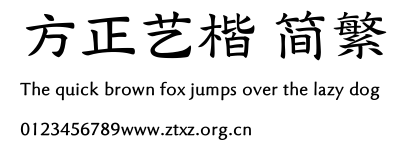 方正艺楷 简繁.ttf是由字体厂商(设计师)方正出品的一款字体.方正字库隶属于北京北大方正电子有限公司(简称方正电子)。方正电子是专业从事中文字库开发的厂商,现拥有各种中、西文以及多民族文种字库数百款。作为享誉全球的方正中文电子出版系统的重要组成部分,方正字库一向以字款丰富,品质精良,适用面广,能迅速满足客户需求而在专业出版、印刷领域中享有盛誉。方正电子一向以推动中文字库技术进步,促进中文印刷字体的发展为己任,每年推出的创新字体都在十款以上。同时,方正电子还积极参与中国国家标准和国际ISO组织相关标准的制订,如GBK、GB18030、ISO/IEC-10646等。方正字库字款丰富、字形美观、性能稳定、适应面广,运行速度快,且存贮容量小。全面支持GB、GBK、GB18030、BIG-5以及JIS、KSC等编码体系,可以提供TrueType,PostScript Type1、Type0、CID等各种通用格式字库。方正字库官网http://www.foundertype.com/index.php/FindFont/index.html?utm_source=zitixiazai
