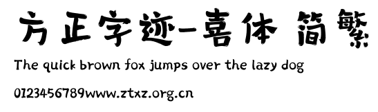 方正字迹-喜体 简繁.ttf是由字体厂商(设计师)方正出品的一款字体.方正字库隶属于北京北大方正电子有限公司(简称方正电子)。方正电子是专业从事中文字库开发的厂商,现拥有各种中、西文以及多民族文种字库数百款。作为享誉全球的方正中文电子出版系统的重要组成部分,方正字库一向以字款丰富,品质精良,适用面广,能迅速满足客户需求而在专业出版、印刷领域中享有盛誉。方正电子一向以推动中文字库技术进步,促进中文印刷字体的发展为己任,每年推出的创新字体都在十款以上。同时,方正电子还积极参与中国国家标准和国际ISO组织相关标准的制订,如GBK、GB18030、ISO/IEC-10646等。方正字库字款丰富、字形美观、性能稳定、适应面广,运行速度快,且存贮容量小。全面支持GB、GBK、GB18030、BIG-5以及JIS、KSC等编码体系,可以提供TrueType,PostScript Type1、Type0、CID等各种通用格式字库。方正字库官网http://www.foundertype.com/index.php/FindFont/index.html?utm_source=zitixiazai