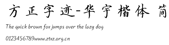 方正字迹-华宇楷体 简.ttf是由字体厂商(设计师)方正出品的一款字体.方正字库隶属于北京北大方正电子有限公司(简称方正电子)。方正电子是专业从事中文字库开发的厂商,现拥有各种中、西文以及多民族文种字库数百款。作为享誉全球的方正中文电子出版系统的重要组成部分,方正字库一向以字款丰富,品质精良,适用面广,能迅速满足客户需求而在专业出版、印刷领域中享有盛誉。方正电子一向以推动中文字库技术进步,促进中文印刷字体的发展为己任,每年推出的创新字体都在十款以上。同时,方正电子还积极参与中国国家标准和国际ISO组织相关标准的制订,如GBK、GB18030、ISO/IEC-10646等。方正字库字款丰富、字形美观、性能稳定、适应面广,运行速度快,且存贮容量小。全面支持GB、GBK、GB18030、BIG-5以及JIS、KSC等编码体系,可以提供TrueType,PostScript Type1、Type0、CID等各种通用格式字库。方正字库官网http://www.foundertype.com/index.php/FindFont/index.html?utm_source=zitixiazai