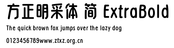 方正明采体 简 ExtraBold.ttf是由字体厂商(设计师)方正出品的一款字体.方正字库隶属于北京北大方正电子有限公司(简称方正电子)。方正电子是专业从事中文字库开发的厂商,现拥有各种中、西文以及多民族文种字库数百款。作为享誉全球的方正中文电子出版系统的重要组成部分,方正字库一向以字款丰富,品质精良,适用面广,能迅速满足客户需求而在专业出版、印刷领域中享有盛誉。方正电子一向以推动中文字库技术进步,促进中文印刷字体的发展为己任,每年推出的创新字体都在十款以上。同时,方正电子还积极参与中国国家标准和国际ISO组织相关标准的制订,如GBK、GB18030、ISO/IEC-10646等。方正字库字款丰富、字形美观、性能稳定、适应面广,运行速度快,且存贮容量小。全面支持GB、GBK、GB18030、BIG-5以及JIS、KSC等编码体系,可以提供TrueType,PostScript Type1、Type0、CID等各种通用格式字库。方正字库官网http://www.foundertype.com/index.php/FindFont/index.html?utm_source=zitixiazai