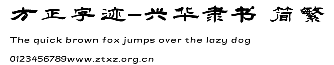 方正字迹-兴华隶书 简繁.ttf是由字体厂商(设计师)方正出品的一款字体.方正字库隶属于北京北大方正电子有限公司(简称方正电子)。方正电子是专业从事中文字库开发的厂商,现拥有各种中、西文以及多民族文种字库数百款。作为享誉全球的方正中文电子出版系统的重要组成部分,方正字库一向以字款丰富,品质精良,适用面广,能迅速满足客户需求而在专业出版、印刷领域中享有盛誉。方正电子一向以推动中文字库技术进步,促进中文印刷字体的发展为己任,每年推出的创新字体都在十款以上。同时,方正电子还积极参与中国国家标准和国际ISO组织相关标准的制订,如GBK、GB18030、ISO/IEC-10646等。方正字库字款丰富、字形美观、性能稳定、适应面广,运行速度快,且存贮容量小。全面支持GB、GBK、GB18030、BIG-5以及JIS、KSC等编码体系,可以提供TrueType,PostScript Type1、Type0、CID等各种通用格式字库。方正字库官网http://www.foundertype.com/index.php/FindFont/index.html?utm_source=zitixiazai